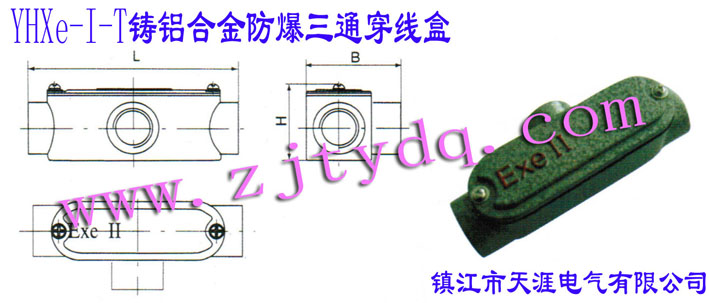 防爆電器 >> 防爆穿線盒 >> YHXe-I-T鑄鋁合金防爆三通穿線盒 AL-alloy Anti-explosion Pull Box of Tee Type 說明: 1、適用范圍: 爆炸性氣體混合物危險場所:1區(qū)、2區(qū) Danger places with gas mixture:Zone 1&2 爆炸性氣體混合物:IIA、IIB、IIC Explosive gas mixture: IIA、IIB、IIC 溫度組別:T1-T6 Temperature group:T1-T6 戶內(nèi)、戶外 indoor,outdoor 2、產(chǎn)品特點: 外殼采用鑄鋁合金,表面噴塑 The closure is made of Cast Aluminum alloy with the surface painting 如需要變徑時可特制 It can be fabricated according to the special requirements 防爆標志:ExeII Explosion-proof Mark:Exe II 防爆等級:IP55 Protection Grad:IP55 結構形式多樣,便于安裝 Many kinds of structures are convenient for installation 3、YHXe防爆穿線盒根據(jù)客戶的要求,在不同的使用場所可選擇一下三種型號:There are three specifications for different purposes 1)、YHXe-I鑄鋁合金防爆穿線盒 YHXe-I Explosion-proof Box of Cast Aluminum Alloy 2)、YHXe-II鑄鐵防爆穿線盒 YHXe-II Explosion-proof Box of Cast Iron Alloy 3)、YHXe-III鑄鋼防爆穿線盒 YHXe-III Explosion-proof Box of Cast Steel Alloy
